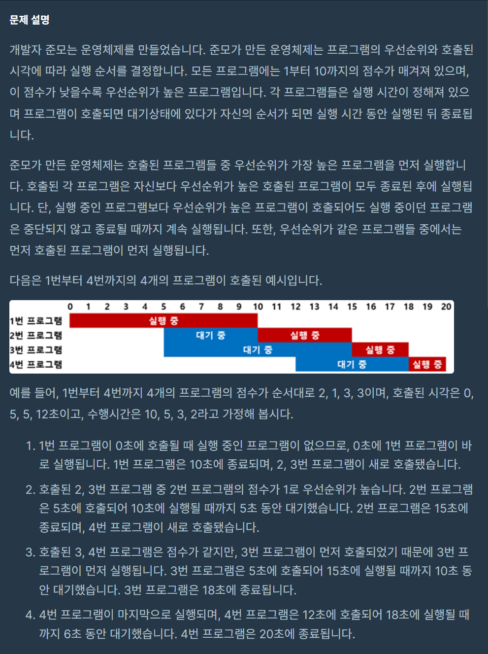 PriorityQueue를 써서 대기열에 넣었다가, 하나씩 꺼내서 실행시키면서 각 점수마다 대기시간을 갱신시켜 주면 된다.