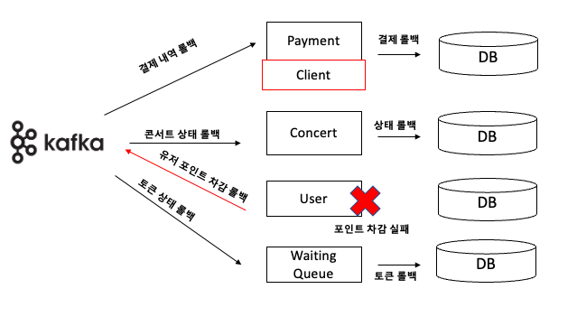 - 프로세스를 진행하다가 여러 서비스를 거쳐 서비스(Payment, User)에서 실패(예외처리 혹은 장애)가 난다면 보상 트랜잭션 이벤트를 발행한다.