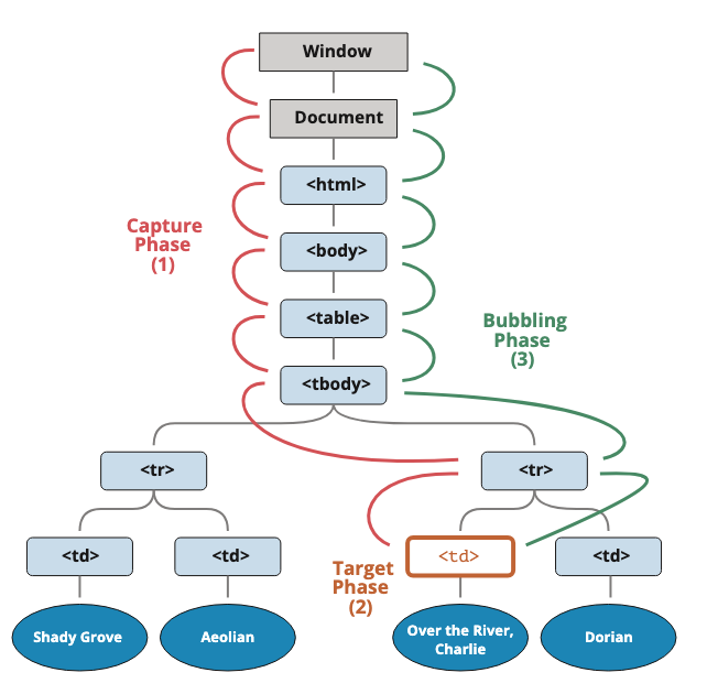이벤트의 흐름은 위 그림과 같은데, 이벤트가 발생한데까지 캡처링이 일어나고, 이벤트가 발생한 곳에 도착한 뒤, 다시 이벤트 버블링을 통해서 이벤트가 등록한데까지 올라가.