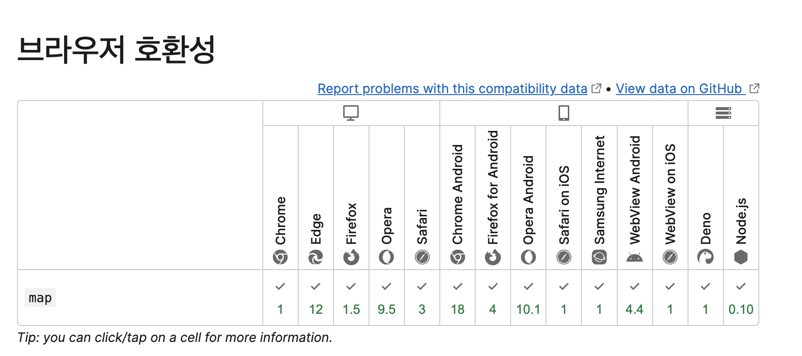 예를 들어서 Array.prototype.map 라는 ****메서드가 JavaScript에 있는데, 이 메서드가 내가 쓰는 브라우저에서 호환이 잘 되는지 보려면 페이지 제일 하단에 브라우저 호환성에 대해서 설명이 나와 있어.