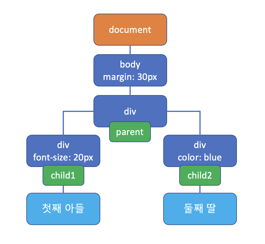 class 이름이 child1인 요소는 글자 크기 20px, 텍스트 내용은 ‘첫째 아들’으로 화면에 그려지고,