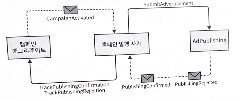 발행 프로세스를 구현하기 위해서 사가는 Campaign 애그리게이트로부터 CampaignActivated 이벤트를, AdPublishing 바운디드 컨텍스트로부터 PublishingConfirmed와 PublishingRejected 이벤트를 기다린다.
