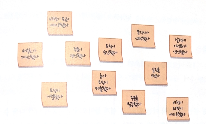 이 단계에서 모든 참가자는 같은 색의 포스트잇으로 무엇이든 떠오르는 도메인 이벤트를 적어서 붙인다.