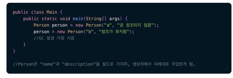 위에서 person은 처음에 “a” 라는 이름을 가진 객체를 참조하게 됩니다. 하지만 곧 이어 person이 “b” 를 참조하게 되며 “a”는 다음 줄에서 참조를 잃어버리게 됩니다. main 함수가 종료되기 직전, person이 가르키는 객체가 “b”를 가르킨 직후에 GC 가 이루어진다고 가정해봅시다. “b” 는 참조가 유지된 상태이기 때문에 GC 의 대상이 아니지만, “a” 는 GC 의 대상이 됩니다. 위의 경우처럼 참조하는 대상을 바꾸거나 메소드가 끝나서 Stack 이 pop 이 되면 참조되지 않는 객체들이 생겨납니다.