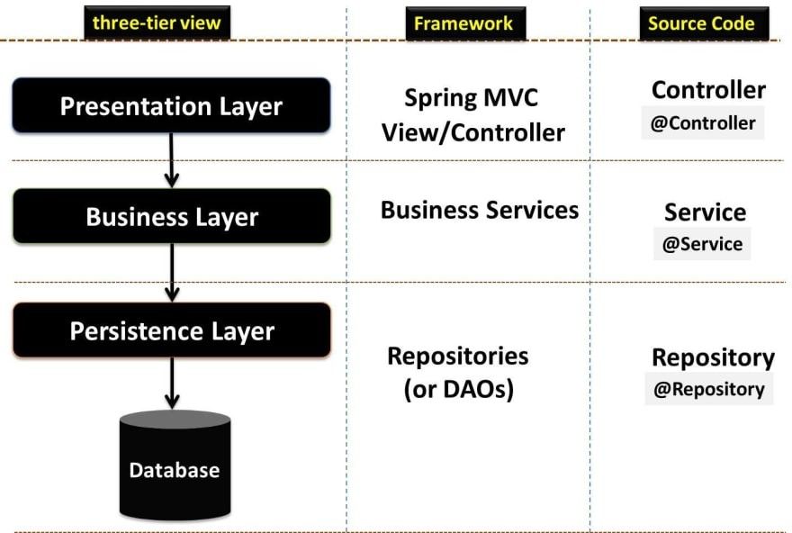 사용자와 상호작용하는 (사용자의 요청을 처리하는) Presentation 계층, 비지니스 로직이 있는 (핵심 로직) Service 계층, 데이터 접근 계층인 (DB에 접근 및 영속성을 다루는) Persistence 계층이 있다.