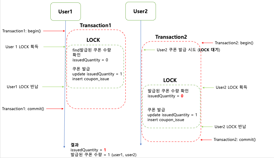 - User1이 쿠폰을 발행한다.(issuedQuantity의 갯수를 하나 증가, but 아직 db에 반영 X)