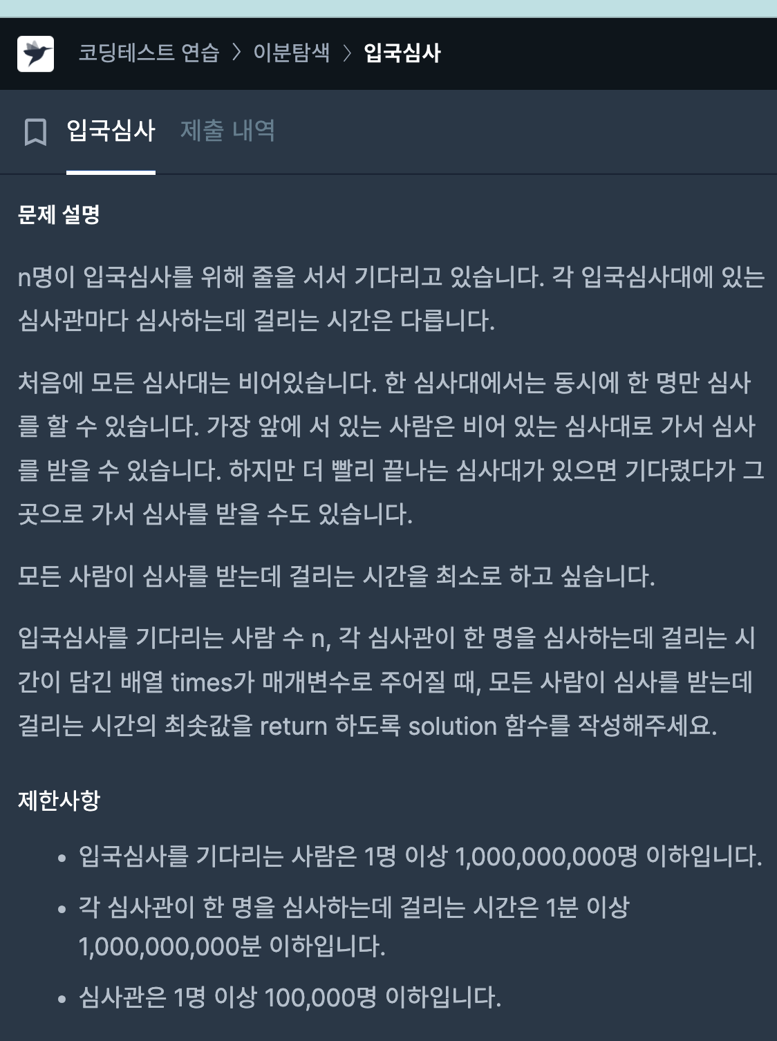 처음에는 Queue로 해보려다가 공간복잡도가 너무 올라갈 것 같아서 포기했다. 실제로 이런 알고리즘이 입국심사대에 이용하고 있을지도 모른다는 생각이 들었다.
