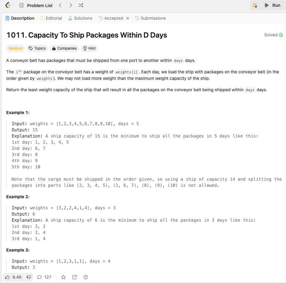 그전에 풀었던 입국심사 문제와 유형이 비슷한 것 같다. 이분탐색의 응용?버전의 문제로 느껴진다. 이분탐색에서 제일 핵심은 범위를 어떻게 좁혀 나가는지다. 통과되는데 걸린 시간이 days보다 작거나 같을 경우 right값을 땡김으로써 mid 값을 줄여 더 걸리는 시간을 늘려준다. 항상 이분탐색을 풀 때 왼쪽을 땡겨야할지, 오른쪽을 땡겨야 할지 헷갈린다. 문제를 더 풀어보며 확신을 가지자!