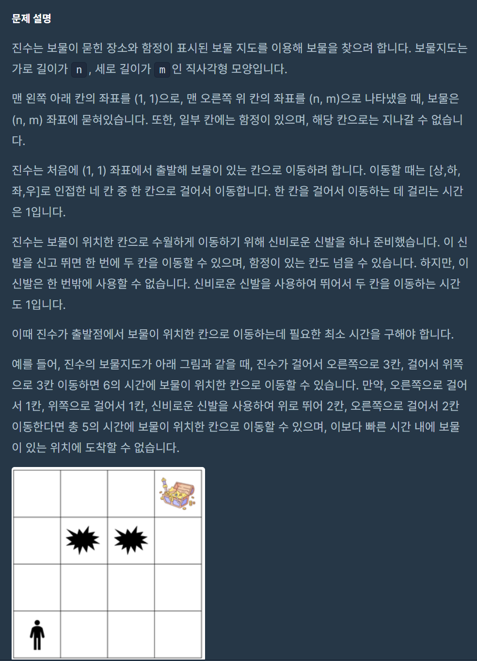 testcase는 통과했지만 전체 테스트는 통과하지 못 했다. 한번 신비로운 신발을 사용하여 점프하는 경우를 아마 통과하지 못 한것 같다. 나의 경우 그냥 정답에서 -1을 해줬는데, 이렇게는 모든 예외케이스를 통과하지 못하는 듯하다. 나중에 한번 더 고쳐보자.